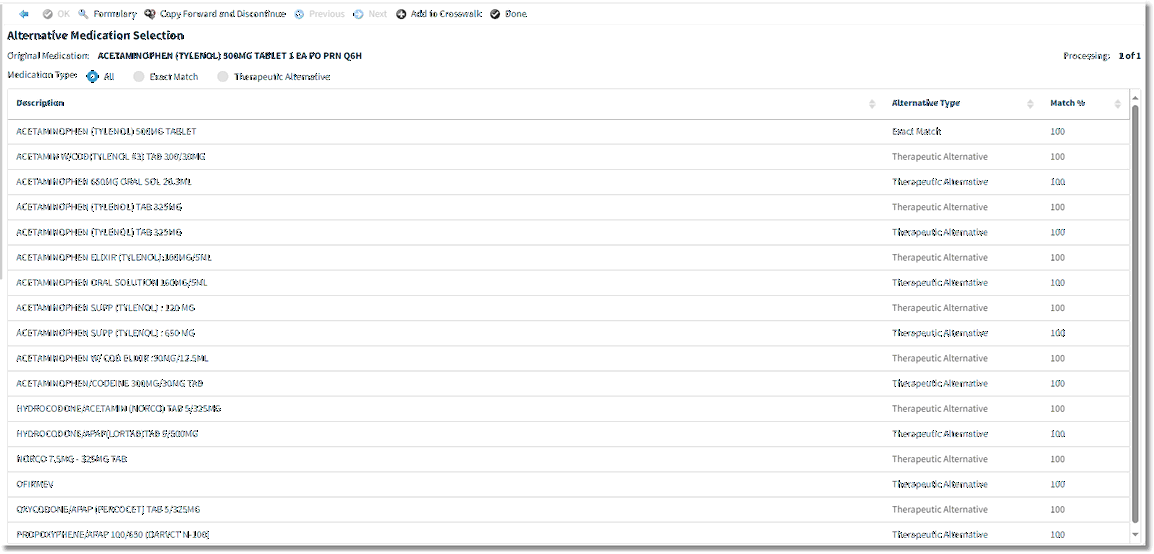 | 3. | The Alternative Medication Selection screen displays for each non IV medication order to be modified. The list defaults to All alternative medication types. The columns contain the Description, Alternative Type and Match percentage. The selection may be filtered by: |